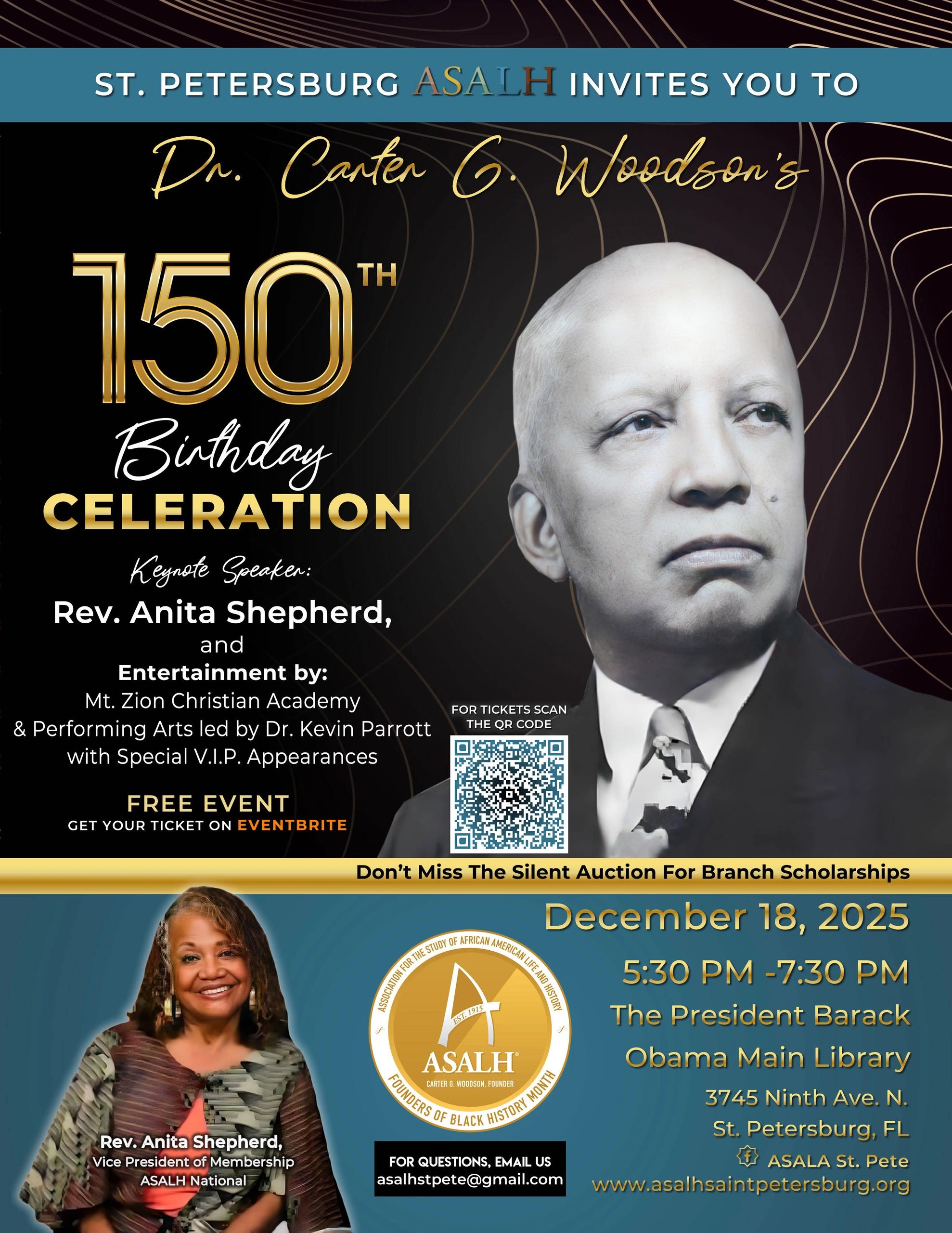 Join us as we celebrate the 150th birthday of our founder, Dr. Carter G. Woodson, with special guest Rev. Anita Shepherd, National Vice President of Membership. We encourage all members to attend as we end the year with celebration. A silent auction will be held to launch our scholarship fundraising efforts.